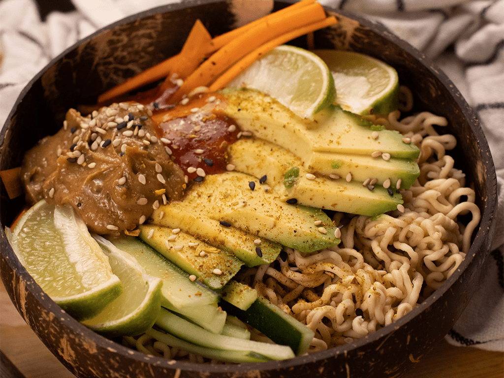 5. Die Mie Nudeln auf 2 Schüsseln verteilen, Karotten- und Gurkenstreifen hinzugeben, mit Erdnüssen und Avocado garnieren und mit dem Dressing servieren.